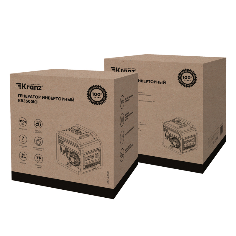 Генератор инверторный KR3500IO KRANZ, 3,5кВт, 230В, 7л, открытый корпус, ручной старт