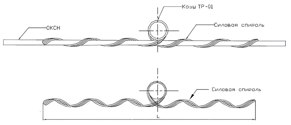 Зажим поддерживающий спиральный для подвески оптического кабеля на опоры ВЛ, контактной сети и автоблокировки ЖД, освещения, связи, городского транспорта, элементах зданий и сооружений с углами поворота трассы до 100 и длиной пролета до 50м включительно.